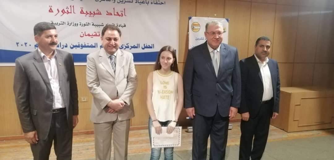تشجيعاً للتفوق وتقديراً لجهود الكادر الإداري والتدريسي، وزارة التربية واتحاد شبيبة الثورة تكرمان ٨٥ طالباً متفوقاً في الشهادة الاعدادية والثانوية بفروعها المختلفة و٥٧ مديراً للمدارس التي تميز طلابها على مسرح مدينة الشباب بدمشق. وأكد وزير التربية الدكتور دارم طباع أن الوزارة تعمل على برنامج لتكريم المعلمين مشيراً لأهمية تعزيز الانتماء الوطني لأن الجيل الشاب هو من يبني سورية ومستقبلها. وبيّن رئيس اتحاد شبيبة الثورة معن عبود العمل لتكريم الشباب المبدع في المجالات المختلفة. وحضر التكريم رئيس المكتب التنفيذي لنقابة المعلمين في سورية وحيد زعل، ومعاون وزير التربية الدكتور عبد الحكيم حماد، وأعضاء المكتب التنفيذي لاتحاد شبيبة الثورة وعدد من مدراء المدارس وأهالي الطلاب المتفوقين.