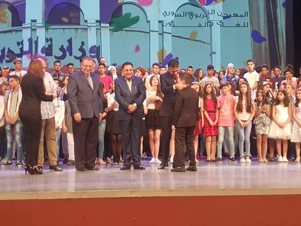 بعنوان: " سورية في عيون طلاب مدارسها " وتحت رعاية السيد وزير التربية عماد العزب عقد مساء يوم الثلاثاء المهرجان التربوي السوري للغات والفنون بدار الأسد للثقافة والفنون، حيث أكد وزير التربية خلال حضوره المهرجان أن أسلوب التعلّم هو العامل المؤثر في نجاح النظام التربوي، وفي بناء معارف المتعلّم، وتكوين قيمه وسلوكياته، ليكون مواطناً قادراً على التغيير والتطوير وبناء المستقبل، لافتاً إلى أن التعلم من خلال المبادرات هو أهم الأساليب الناجحة في تطوير التعلّم ومهاراته، الأمر الذي يستدعي وجوب توجه المناهج التربوية نحو تعزيز امتلاك هذه المهارات لدى المتعلّم؛ من خلال العمل واللعب والمشاركة، لتكون المدرسة شائقة وممتعة له، يبني فيها سلم تطوره الفكري والجسدي وصولاً إلى حياة أفضل. مضيفا أن تجربة وزارة التربية في هذا العام في إطلاق المبادرات الطلابية للغات والفنون تشكل نموذجاً جديداً للتعلّم أثبت من خلاله أبناؤنا وبناتنا والزملاء المعلمون قدرة المؤسسة التربوية السورية على التجديد والابتكار والتطوير، فانطلقت هذه المبادرات على امتداد سورية التي شكلت مثالاً في القيم والأخلاق، فمنها كانت أول كلمة، ومنها ظهر أول لحن، وبها نظّم أول قانون للبشرية، منها انتشرت الديانات السماوية لتجعل للحياة معنى وللإنسان قيمة. و قد افتتح المهرجان بالنشيد الوطني للجمهورية العربية السورية ، تلاه عرض موسيقي مسرحي راقص مأخوذ من بعض الأعمال الفائزة على مستوى القطر بعنوان "سورية في عيون طلابها"، عرضت فيه بعض مبادرات الطلاب من فرقة عوج بحماه، وكورال فيروزيات من السويداء، وعزف جماعي وفردي على العود والقانون والبيانو من حمص وحلب، وغناء انكليزي وفرنسي وعربي سولو من حلب والقنيطرة وريف دمشق ودمشق، ورقص تانغو مصاحب بغناء من حلب، وغناء جماعي روسي من طرطوس، مع فرقة رقص شعبي من حماه، وفرقة رقص تراثي من الحسكة، ورقص باليه لفرقة مسرحية درج السما من حماه، ومقطعين من فرقة مسرحية البخيل من حلب، ومن فرقة مسرحية وحدي من السويداء۔ وفي نهاية المهرجان الذي اختتم بالنشيد الوطني للجمهورية العربية السورية تم تكريم الفرق والأفراد الفائزين بالمبادرات الطلابية على مستوى القطر، كذلك الفائزين في مسابقة حلوة يابلدي.