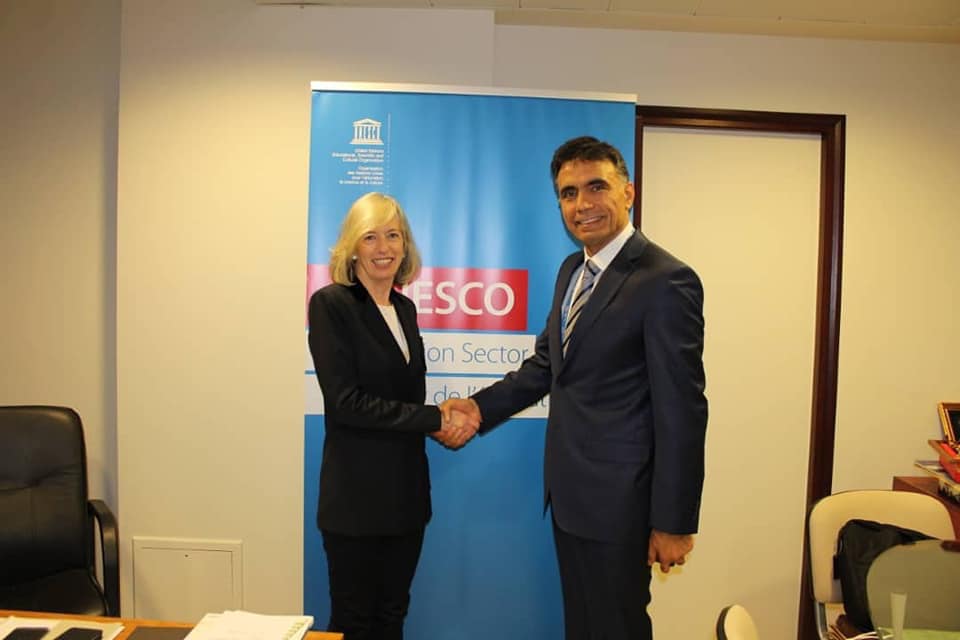 متابعة لمشاركة وزير التربية عماد موفق العزب والوفد المرافق له في فعاليات الدورة (40) للمؤتمر العام لمنظمة الأمم المتحدة للتربية والعلم والثقافة_ اليونسكو_ في باريس. عقد وزير التربية اجتماعاً موسعاً مع المدير العام المساعد لقطاع التربية في المنظمة ستيفانيا جيانيني، قدم خلاله الوزير العزب عرضاً للجهود الكبيرة التي قدمتها حكومة الجمهورية العربية السورية ممثلة بوزارة التربية؛ بهدف استمرار العملية التعليمية التربوية، لاسيما العمل على ترميم المدارس المدمرة بفعل الإرهاب، و استيعاب الطلاب المتسربين كافة، و تحسين البيئة المدرسية من خلال تطوير المناهج، والنهوض بقدرات الأطر التدريسية مواكبة لهذه المناهج. كما قدم الوزير العزب عرضاً لمؤتمر التطوير التربوي، الذي عقد في دمشق خلال شهر أيلول الماضي، ومانجم عنه من توصيات، وخطط زمنية لتتبع تنفيذ توصياته. وفي نهاية اللقاء سلم الوزير العزب السيدة جيانيني الخطة الوطنية للتربية في الجمهورية العربية السورية نحو الوصول لتحقيق الهدف الرابع من أهداف التنمية المستدامة، والتي أُعدت وفق منهجية علمية تربوية وبأطر وطنية اختصاصية. حضر اللقاء معاون وزير التربية د. فرح المطلق، معاون وزير التعليم العالي د. رياض طيفور، مستشار وزير التربية تمام هلال، امين اللجنة الوطنية لليونسكو د. نضال حسن.